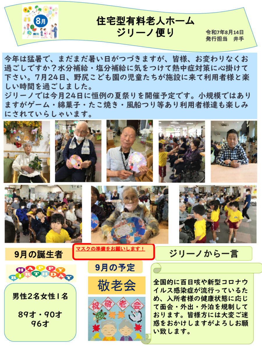 no 住宅型有料老人ホーム ジリーノ便り2025年8月 | 住居型有料老人ホーム 聖人の家 ジリーノ - 宮崎県小林市野尻町 野尻中央病院グループ